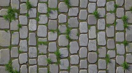 stone pavement with sprouted grass in a summer park top view