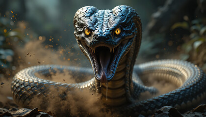 A Cobra With Its Mouth Open And Fangs Showing In A Dusty Environment With Bright Yellow Eyes Staring