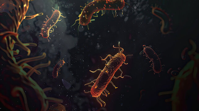 A scientific illustration captures the diversity of bacteria, highlighting their unique shapes and textures in radiant colors against a dark background.