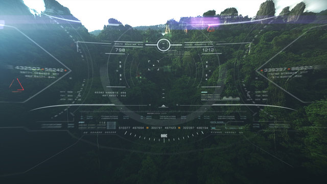 Futuristic radar digital interface with rocket schematic