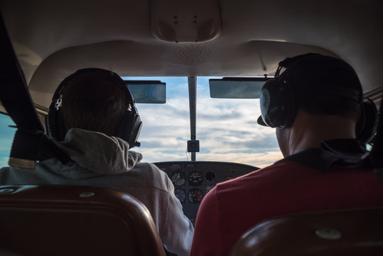 Cockpit view of a small Cessna airplane in flight