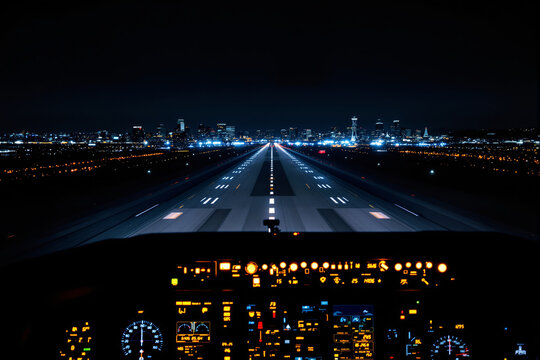 Aerial view from cockpit at night over city runway illuminated by lights.