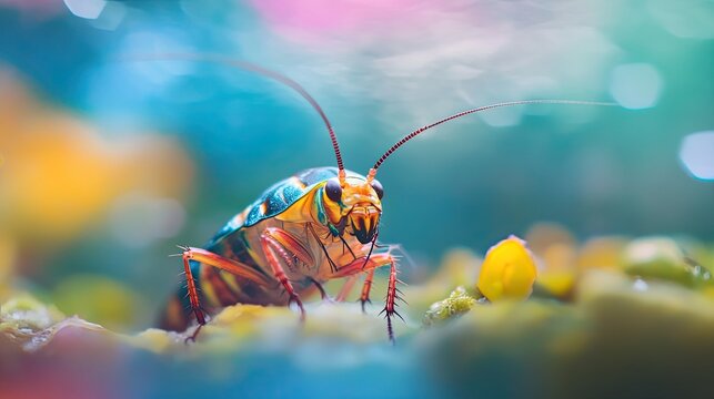 cockroach interacts with toothbrush in colorful setting, evoking curiosity and surprise