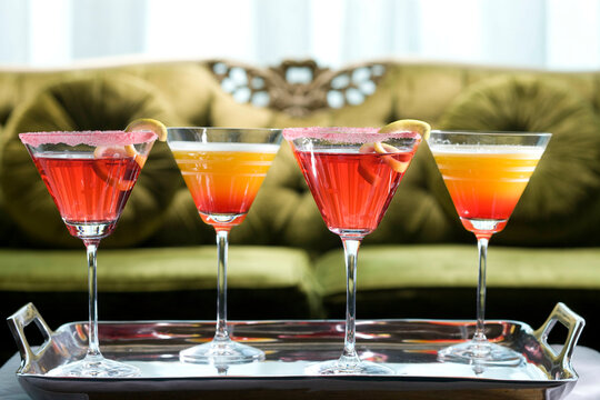 Close up of two female hands holding red cocktails against vibrant yellow background, copy space