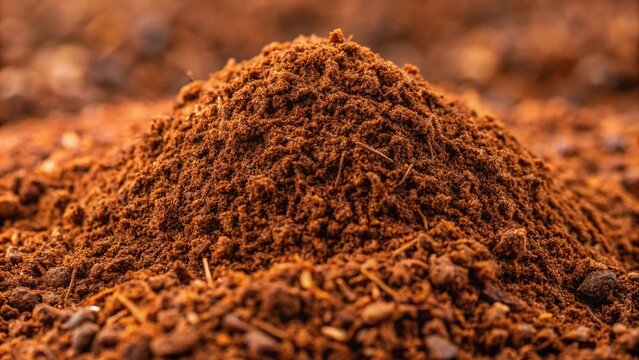 A heap dark brown Coco Peat soil amendment surrounds a small potted plant, highlighting the sustainable gardening material's moisture-retentive properties and earthy texture