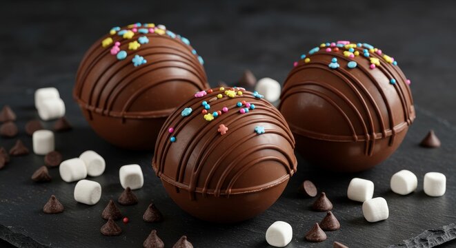 Hot chocolate bombs with sprinkles and marshmallows.