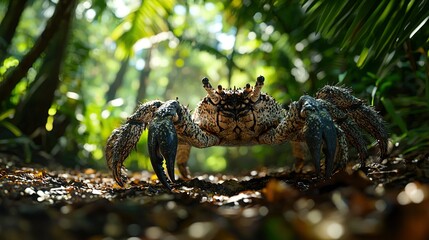 Coconut crab climbs tree trunk in lush tropical forest showcasing vibrant claws and warm earthy colors