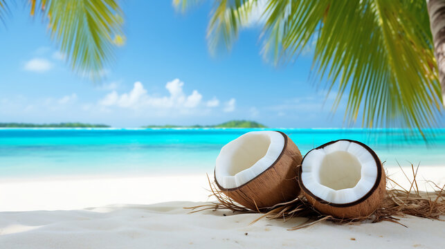 Tropical Beach Paradise with Fresh Coconuts on White Sand. Summer Vacation and Natural Refreshment Concept