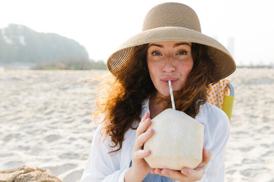 waist up portrait cheerful young brazilian afro hairstyle woman walking on the beach holding a coconut water in Ipanema