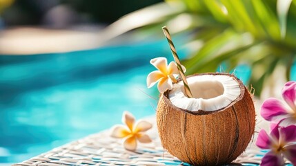 Coconut drink with drinking straw and umbrella isolated on a mint blue background. Exotic beach cocktail in coconut bowl. Fresh Coconut water, Coconut juice, milk. Summer vibes.