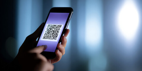 Man in a suit touching a glowing digital qr code with futuristic circuitry elements on a dark background