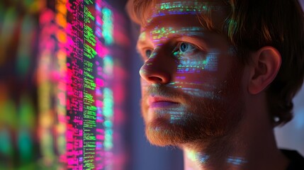 Digital Enigma: A pensive man with a beard gazes intently, illuminated by a mesmerizing cascade of colorful digital code, hinting at a world of complexity and possibilities.