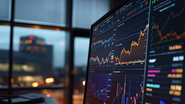 Stock market trading platform charts exchange graphs on pc computer screen. Financial technology online investment data digital money prices indexes crypto analysis and forecast background.