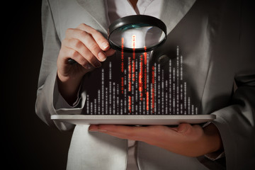 exploration of digital data through a magnifying glass against a backdrop of binary code