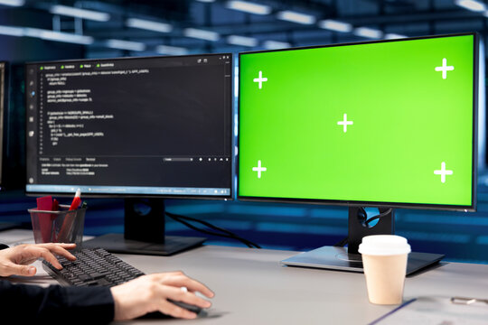 Lines of code running on isolated screen computers displays in data center, used for troubleshooting rackmounts in server rows. Close up of programming scripts on chroma key PC monitors in server hub