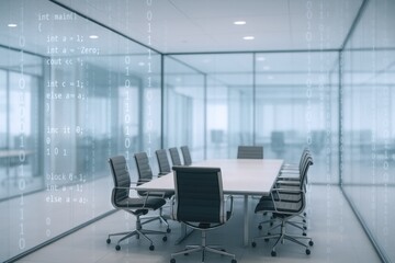 Modern Conference Room with Glass Walls and Digital Code Overlay, Emphasizing Technology and Innovation