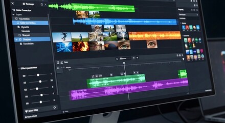 Artistic composition of a video editing application interface, showing multiple colorful sequences, audio waveforms, adjustment layers, and effects panels