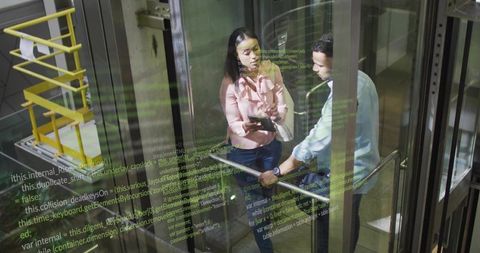 Colleagues reviewing code on tablet in glass elevator with programming overlay