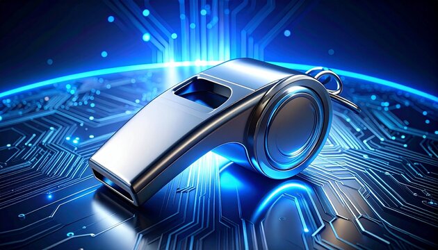 Futuristic camera lens with glowing neon circuits and pulsing binary code