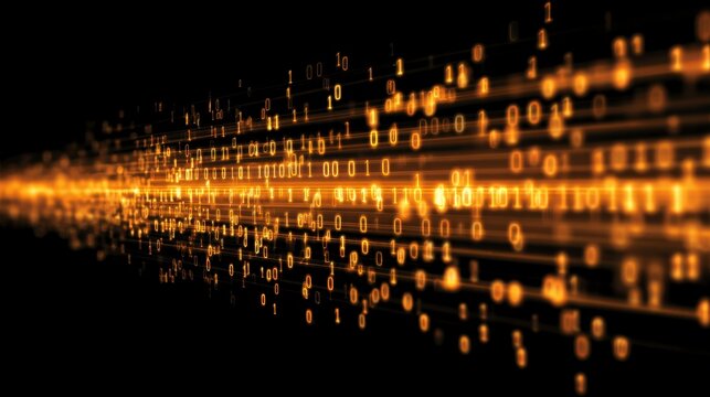 An abstract depiction of binary code flowing across a dark background, with a warm, glowing color scheme