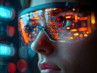Hacker in augmented reality glasses infiltrating a quantum mainframe