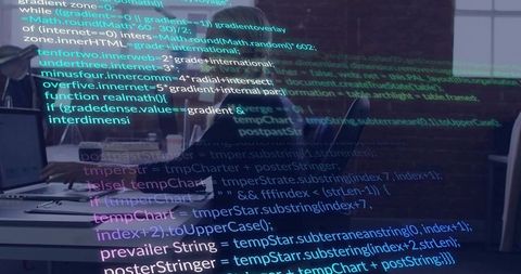 Software developer coding at desk with transparent binary code overlay