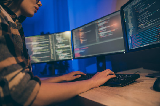 Young coder in eyeglasses is working remotely from home late at night, looking on display, typing code. Hard worker, programmer working overtime, taking work at home, has deadline.