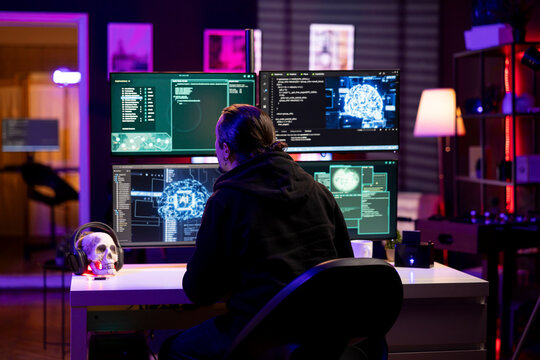 Hacker programing in dark home office coding project for cybersecurity