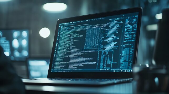 Laptop displaying complex programming code in a dimly lit room, emphasizing coding and software development.