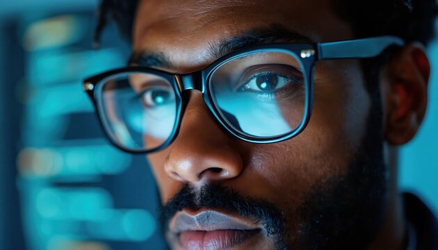 Man with glasses looks at computer screen with blue code. Programmer works on software project at night. Developer codes complex algorithm for AI, analyzes data.