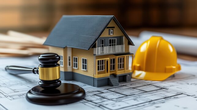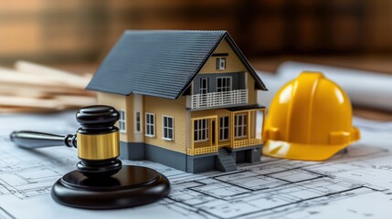 Gavel and construction materials signify legal aspects of building projects in a workspace setting