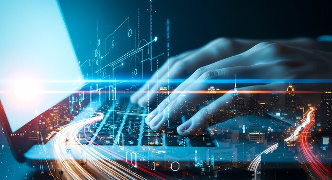 A person's hand using a laptop with digital code overlay against a city skyline, symbolizing technology and innovation.