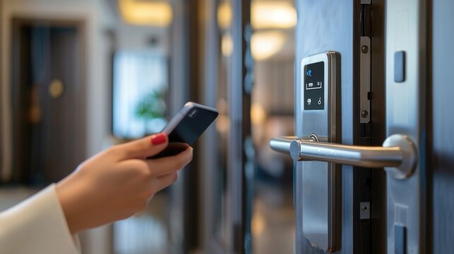 Closeup of a woman's finger entering password code on the smart digital touch screen keypad entry door lock in front of a hotel room or apartment, Modern security, Keyless, Smart device concept