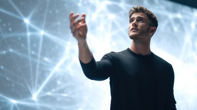 A man gestures upward, standing in front of a digital, futuristic network background glowing with connected points.