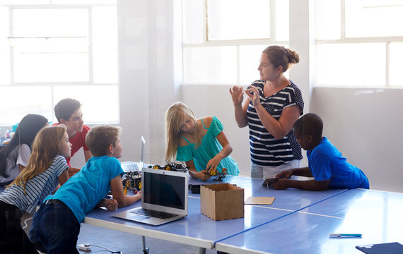 Group Of Students In After School Computer Coding Class Learning To Program Robot Vehicle