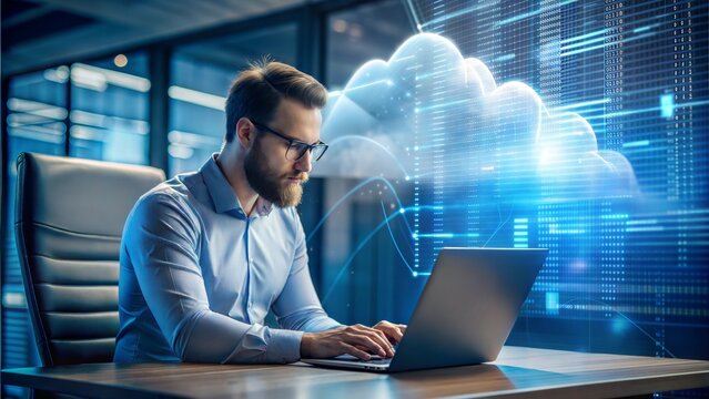 Full-stack developer working on cloud integration, coding in the background, modern software development process.