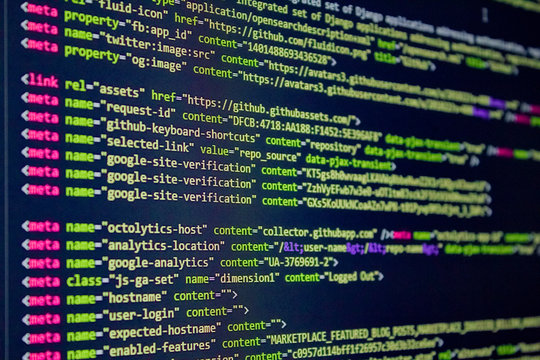 Creative coding html language on blurry backdrop. Web developer and programming concept.