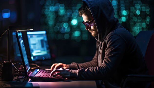 Developer coding on laptop with purple hud overlay for data analysis and ar visualization
