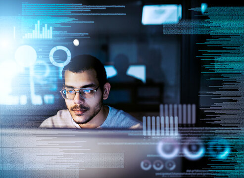 Close-up Portrait of Software Engineer Working on Computer, Line of Code Run Aroung Him. Developer Working on Innovative e-Commerce Application using Big Data Concept