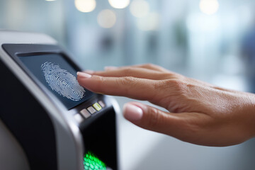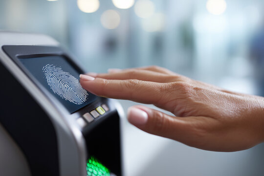 A woman is touching a fingerprint scanner