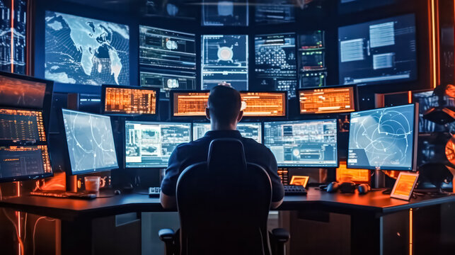 African american it specialist working with coding language and infographics, improving server security on terminal window. Young programming student learning to use code and hardware. Camera A.