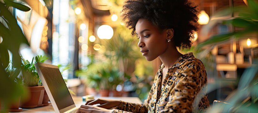 Thoughtful Black software developer in her 30s deeply engaged in coding on her laptop in a spacious coworking area a modern tech professional in autumn. Copy space image. Place for adding text