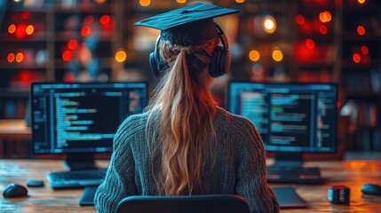 Focused female student with headset studying code on computer screens.