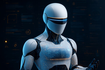AI generated digital artwork of a humanoid robot with glowing circuit lines and holographic data projections representing advanced technology and intelligent systems.