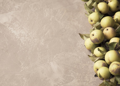Branch of wild apples on brown shabby background.