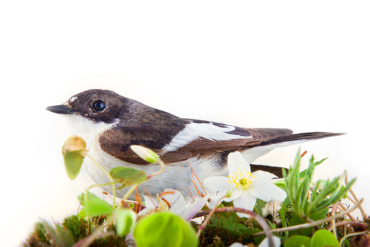 Spring in form of bright plumage of birds (male pied flycatcher)