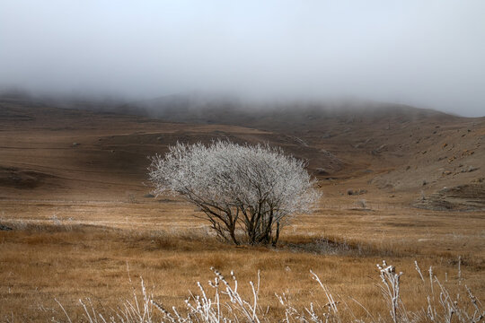A frost-covered wild apple tree in the foothills. Icy mist drips down from the mountains. The illusion that the tree is covered with white flowers like in spring. North Caucasus