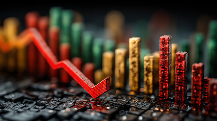 A close-up view of a financial graph with falling red trend line against colorful bar charts, symbolizing market decline.
