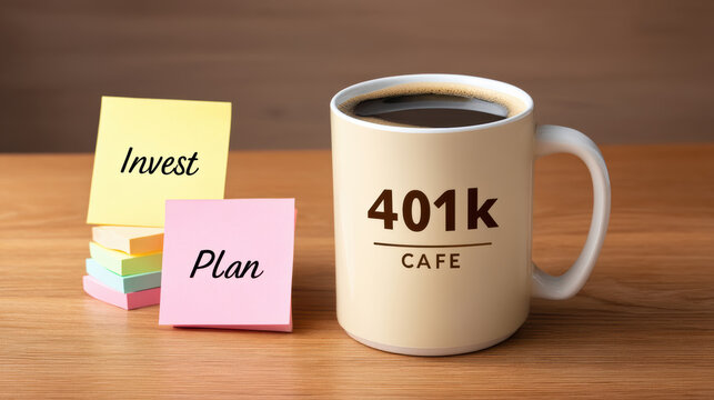 401k coffee cup with invest and plan sticky notes on wooden table for financial planning and retirement saving concept