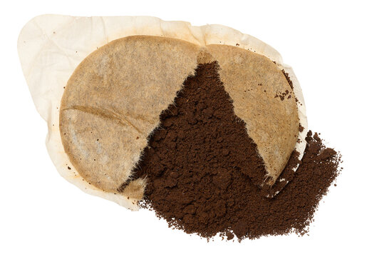 Torn round coffee pod or single serving of ground coffee wrapped in filter paper. Isolated background